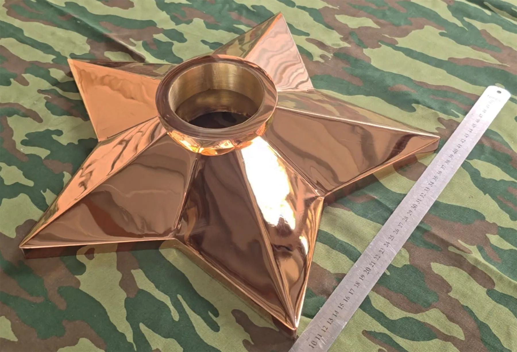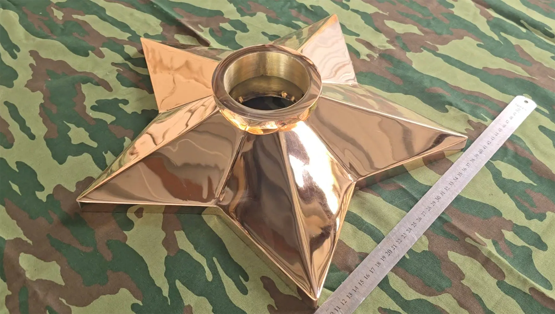 На видео вы видите пример нашей работы – объёмную звезду Вечного огня из листовой бронзы диаметром 500 миллиметров и отверстием горловины под газовую горелку ГВД 379 10 89 00 ПС.